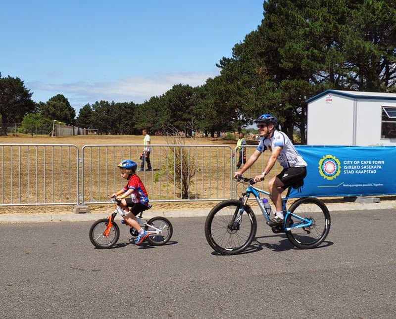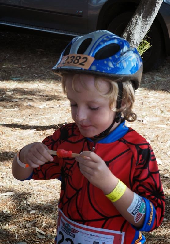 Five kilometres seemed a ridiculously short distance but watching Ben’s legs spinning rapidly, I realised how much longer it would seem when measured out in turns of his 16″ wheels as opposed to my 27.5″ ones. He seemed undaunted though, passing up the opportunity to stop at both drinks tables on the first lap.