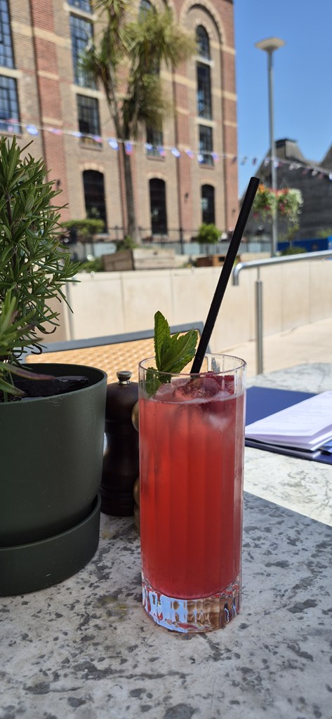 The little coffee stand I had noticed in one of the parks didn’t look like it would offer substantial food, so I rolled towards the main shopping area. My powers of observation failed me at the first cafe I pulled into – it was Carvery only today, and my stomach just could not handle a full roast dinner in this heat. The shopping centre main square (actually a circle with fountains the kids were splashing in) was a much better fit. I pulled into the a Côte cafe and grabbed the only spare table with shade. For some reason, my eye landed on a supposedly fiery hot chic pea and tomato Mediterranean concoction. I would not normally order vegetarian, but this sounded tasty and not overly heavy on the stomach. All of which proved true, except the fiery part – I mean it had some spice, but honestly it could have done with being a degree or two up on the Scoville Scale. The fruity, non-alcoholic cocktail on the other hand was spot on. To round things off nicely, the very posh sounding family on the table behind me kept an eye on my rig as I use the loos. I vaguely remember a brief conversation with them about where I was going, with the usual raised eyebrows when the full extent of the tour sank in. Honestly, that look of incredulity is one I will never tire of, as someone tries to decide if they misheard me, or I’m some kind of lunatic.