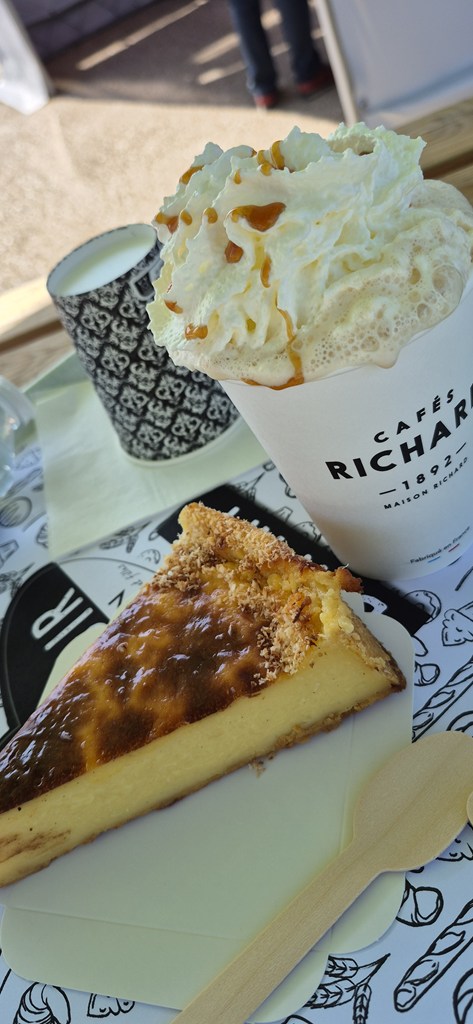 I was only vaguely aware that what gradient there was had levelled out when the path cut through the middle of Le Neubourg. And I mean that quite literally. I was not ejected onto surface streets, which is the norm where cycle ways enter towns. This one went slap bang through the middle, avoiding traffic completely aside from a few crossings with the actual town streets. There were even a few of the old rail buildings left in place as it sliced across the town. I did take a short detour from the trail here though. I’d noted this town as a possible place for a quick refuel, and as I waited to cross one of the streets in the middle of town I spotted a promising looking sign for a cafĂ©. Swinging quickly down the road it signposted led me into the car park of a garden centre but, more importantly, there was a coffee stand outside. I wasted no time grabbing coffee, a pastry, a juice, and water refills. With the heat building, they’d be essential, and I’m sure that if I hadn’t already shed them, this was where I ditched any remaining outer layers. It was just the kind of stop I love: modest, everyday, and unassuming – an simple bench in an unremarkable, but no unpretty, spot with great coffee and a superb slice of pie. Unusually for me, I went with the full trimmings of cream and caramel sauce on the coffee. It looked outrageous, and tasted even better.