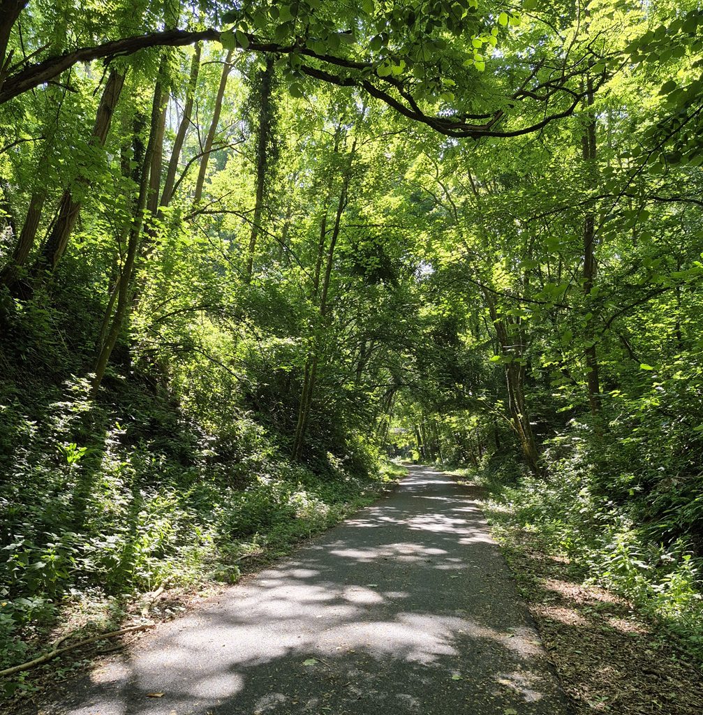 It didn’t end though – it just kept going and going. Kilometre after kilometre of trail, dappled luscious green under an almost ever present canopy of trees. As well as peaceful, easy, riding, I’d also got my shade – at least for now. Except at times, I noticed it wasn’t quite as easy as the path seemed like it should be. Gradually, the reason dawned on me. This was the route of an old railway line. And railways don’t climb steep inclines, but they do go over hills. Very gradually, on shallow grades. Which was exactly what it dawned on me I was doing. This was the 2nd ramp of the day, but at steam engine scale not car scale. I was making good progress, but it was harder than it looked like it should be because I was pedalling gradually uphill the whole time. None of this bothered me of course, it fact it was both a revelation and relief when my brain figured it out. I was getting over that 2nd hump with no traffic, no sun, just delightful woodlands and surrounded by birdsong.
