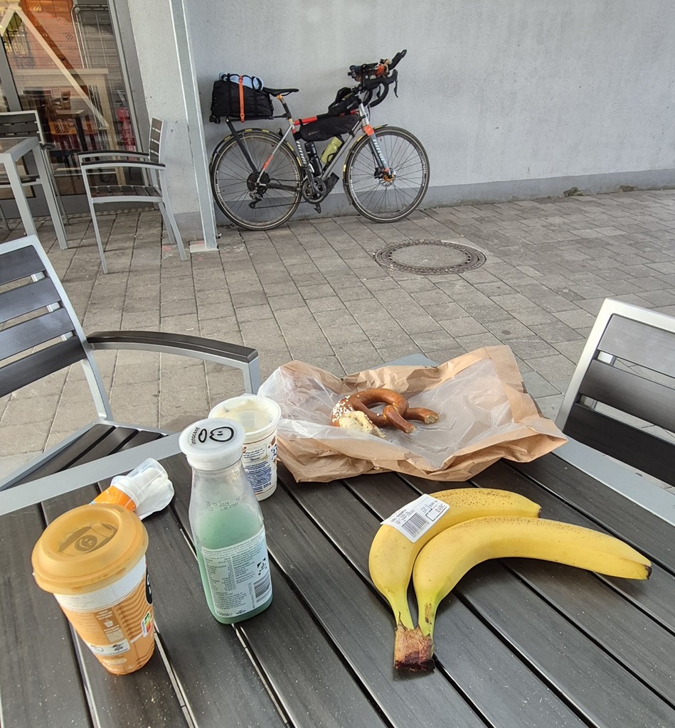 Sure enough, the owner’s dad had opened up the garage and I was kitted up and rolling out quickly. Although I’d barely even got pedalling before I saw the supermarket on my left, and swung around into the car park. Leaving a bike propped outside while you grab suppliers is always a little nervy, but in this case it was quiet – there was almost no one around. Plus I could pretty much see the bike for most of the time I was shopping. Which wasn’t long. NC4K insincts kicked in and I knew exactly what I was shopping for. Minutes later I was sat outside tucking into what I hoped would be the last “home-made” breakfast of the tour. The idea of the shorter days was to enjoy proper breakfasts, but when circumstances change, you adapt.