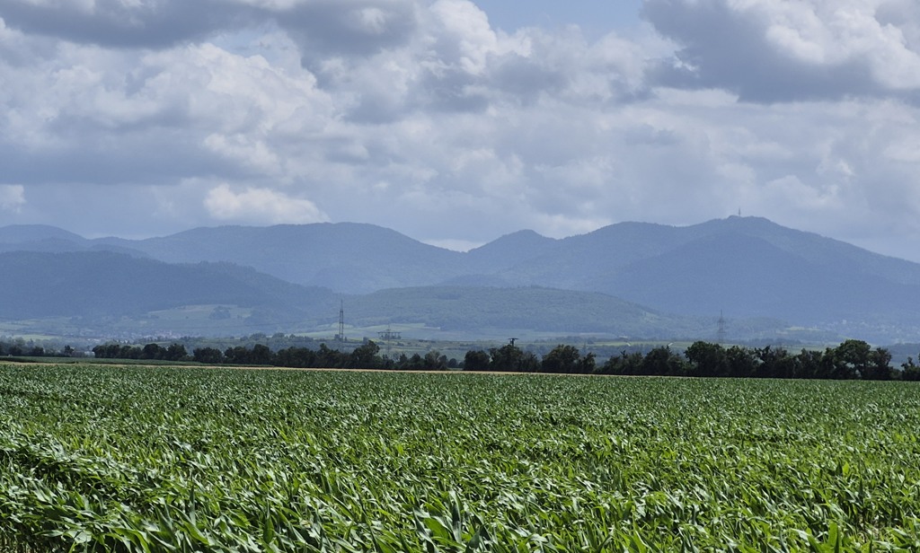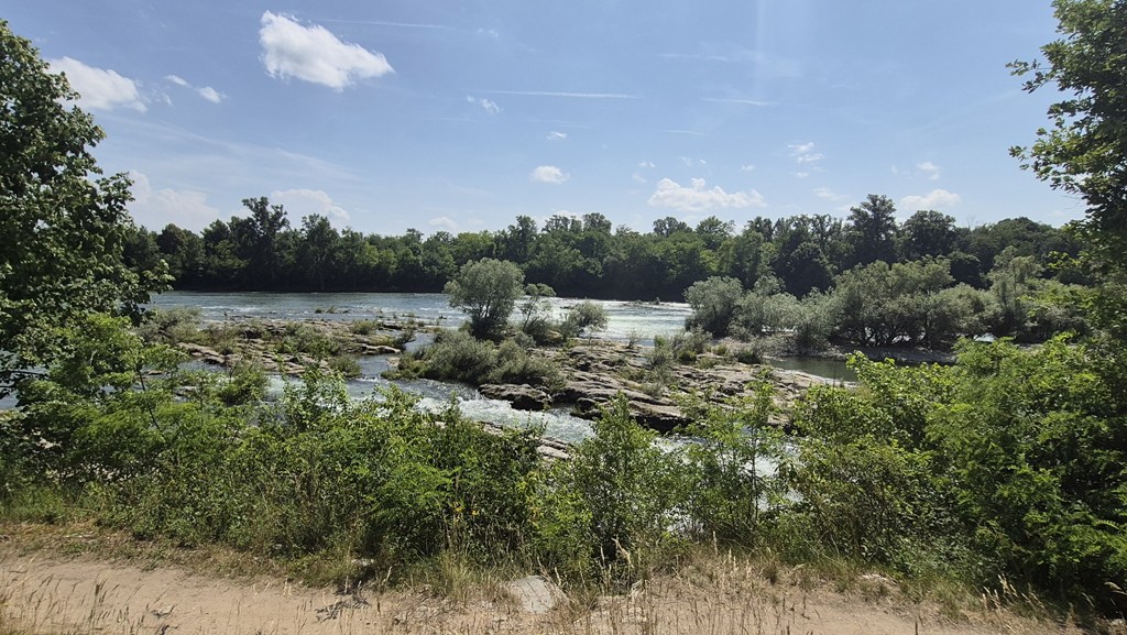I only managed an hour and a half of riding after the early lunch stop before the heat of the early afternoon sent me looking for ice cream and more water. And sadly, I don’t have a lot of recollection of the section in between. I can see from the map that technically, what I was riding along was actually the Rhein, as opposed to what seems to be marked as the Grand Canal d’Alsace beyond. Honestly, in the intense glare of the summer sun it was all just a big expanse of water to my right – pretty to ride along, but hard to picture which bits were what. I was aware of the mountains to my left slowly closing in which I knew meant the part where I “turned the corner” (both mentally and in terms of how it looks on the map) was not that far ahead. But with no real rush today, a need for ice cream & shade came first.