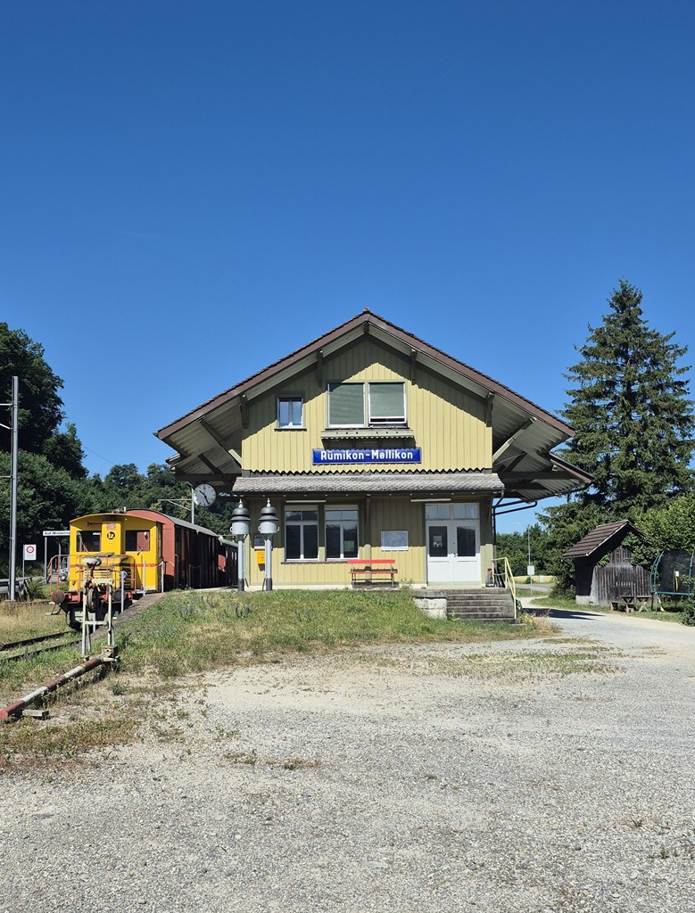 At a parking area beside the river the cycle path became lane again, and that lane only went one direction, up. Again, I made the mistake of optimism – it wasn’t far to where it banked around beside a tree and seemed to flatten off. Once there though, I could see it grinding inexorably onwards and upwards thru vineyards. Somehow, despite heavy load and heavier heat, my determination held firm and the legs kept going. One final punch between houses, and I swung left into a village street. At this point two things need to be said. Firstly by normal standards, this was nothing. It was a kilometer of uphill on a gradient that varied up to around 12%. The only thing which made it a challenge were the conditions under which I rode it. And the other part to mention, is this was not the top. Another 2.5km remained still, albeit with a much shallowed gradient. In fact the second part would have been lovely, snaking around through wooded hillside. Except it was a busy road, with poor sightlines, and I was travelling slowly. So I was nervously aware the whole time of how little braking distance a fast moving car was going to have. I did myself to make myself visible as wide as possible around the bends, and despite tired legs, got myself up and over it as quickly as I could. Although I was kind of sad when it did come to an end. I’d enjoyed the last few hours jinking up and down along the foothills on the Swiss side of the river even with the punchy bits. Looking at the photos now, after the fact, I spotted a quaint little old railway station which I passed along the way.