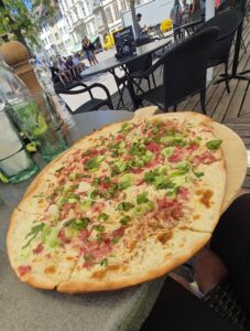 The view, and the food were both stunning. The dish I ordered was Flammkuchen – a recommendation from Christopher which immediately caught my eye on the menu. Lighter than pizza but just as tasty, and with a freshness from the spring onions – it was a perfect choice now the full heat of the afternoon was kicking in. Anything more substantial would have just sat like dead weight in my tummy.