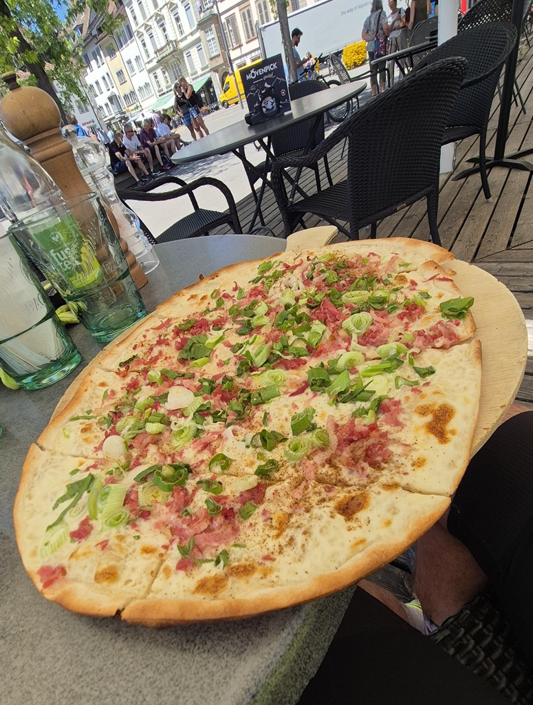 The view, and the food were both stunning. The dish I ordered was Flammkuchen – a recommendation from Christopher which immediately caught my eye on the menu. Lighter than pizza but just as tasty, and with a freshness from the spring onions – it was a perfect choice now the full heat of the afternoon was kicking in. Anything more substantial would have just sat like dead weight in my tummy.