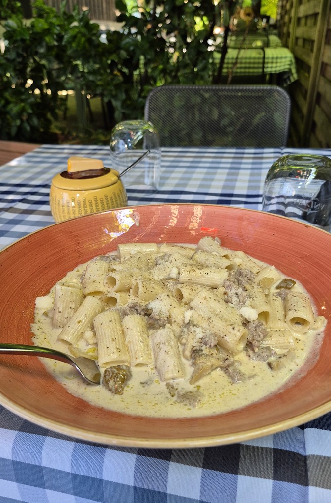 Sadly the B&B no longer served evening meals (although I’d only learn just how much of a loss that was the next day). Instead, the owner directed me to an Italian restaurant two blocks away which served up just what was needed. A hearty bowl of pasta, a cold panache, and all in a shady garden under a canopy of large oak trees.
