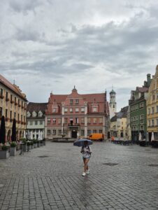 I passed up a few places which would probably have made a good lunch stop due to it being too early and not really being hungry. As I rolled across what would turn out to be pretty much the last hill of the whole ride though a few things struck me. Firstly, in the distance were the very clear indications of a large city – I was beginning the long run into Munich. Next, there was a more immediate, fairly sizeable town immediately ahead of me. On reaching the outskirts of that town though the most noticeable indication struck me. It was going to rain – soon – and hard. Towering black thunderclouds had suddenly risen up in the sky. The cycle path ran out from the fields it had been crossing and dumped me onto a town street. I looked left and right for options – not seeing anything at first. A check of my phone though confirmed that what looked like a supermarket some ways along the road had a café. With luck, if it was open, I’d be there in time to sit out some of the coming storm.