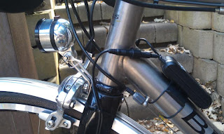 The next stage of the electrical system was the rear light also powered from the dynamo. This proved a relatively simple process as the cabling runs as a spur from the front light, taking advantage of the built in voltage overload protection circuit of the front light. I had originally intended to run the cabling along the down tube, but couldn’t achieve a tidy result clear of gear cables, so I opted instead to go along the top tube. It took quite a few wraps around the seat stay and back up the mudguard stay to lose the excess cable length so I could use the pre-wired spade connectors rather than having to strip and wire my own. The end result looks about as neat as I reckon is possible given that some cable ties are inevitable with nothing else to attach the wiring too.
