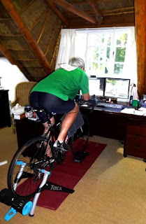 Swinging left at the circle was like having the brakes taken off the bike, the strong wind suddenly now at our backs, pushing us effortlessly along to the waiting team car. The shortest of stops, just a quick swig of coke and Black Cat bar and we mounted up again. Cycling now in sunshine and with the wind behind us, we flew along, my Garmin ranging between 35 and 40km/h for long sections of this stretch.We rode through a purple, Jacaranda lined lane, passing the vineyards of Van Loveren and De Wetshof, where Yoli and I had gone winetasting a few years back with her family.